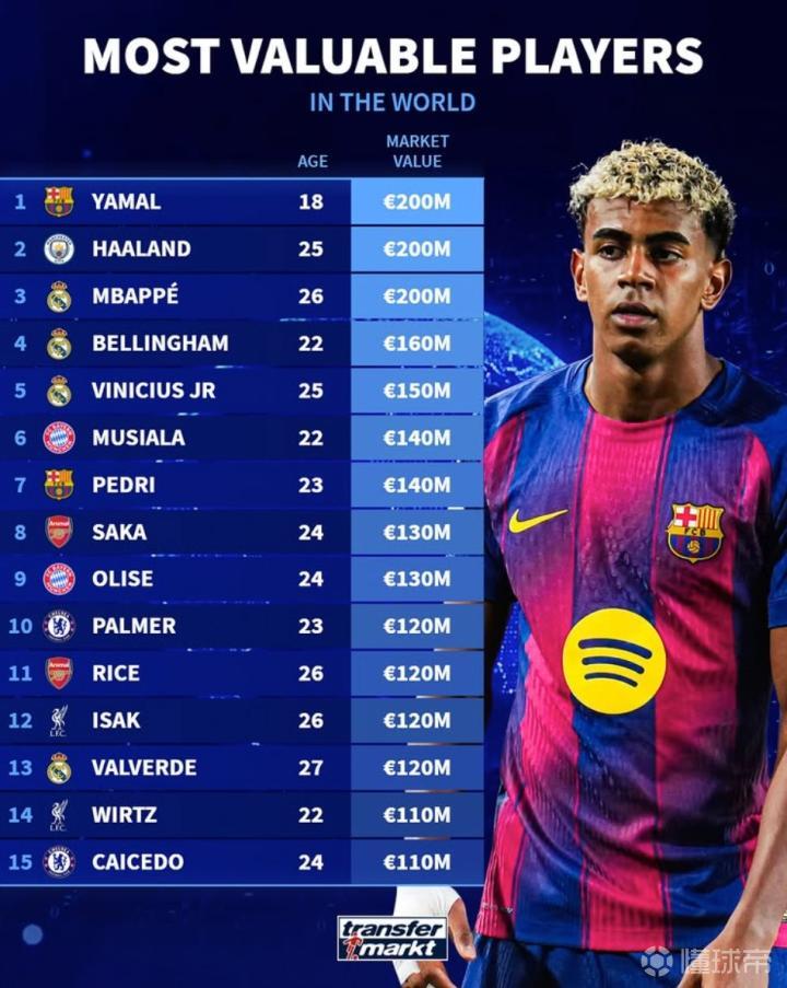 北京時(shí)間12月13日,德國轉(zhuǎn)會(huì)市場網(wǎng)站(德轉(zhuǎn))最新發(fā)布了全球足壇身價(jià)最高的15名球員榜單。其中,亞馬爾、哈蘭德與姆巴佩以2億歐元的身價(jià)并列榜首,緊隨其后的是身價(jià)1.6億歐元的貝林厄姆,以及身價(jià)1.5億歐元的維尼修斯。