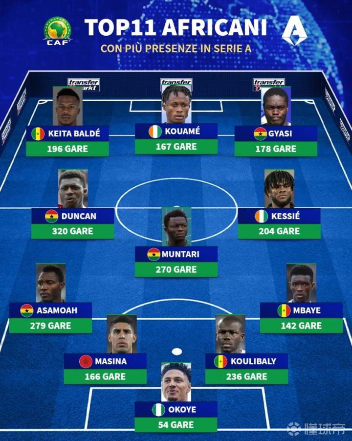 北京時間12月13日,德國轉(zhuǎn)會市場網(wǎng)站精心梳理出意甲賽場歷史上出場次數(shù)最耀眼的非洲球員11人夢幻陣容,庫利巴利、凱西、蒙塔里、阿薩莫阿以及凱塔-巴爾德等球星赫然在列。